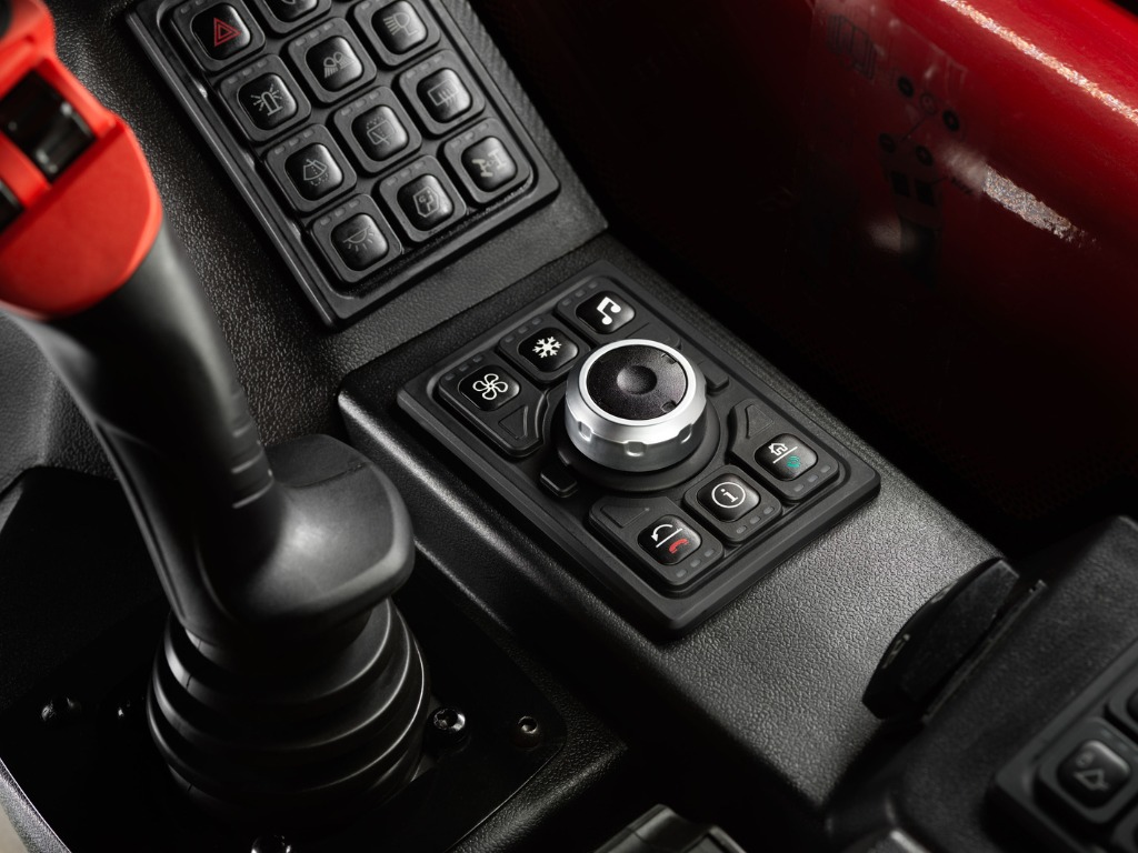 Hytten är ROPS/FOPS-certifierad och utrustad med 10” pekskärm, luftkonditionering, Bluetooth-radio och justerbar fjädrad stol. Säkerheten förstärks med lastövervakningssystem, backkamera och integrerade varningsfunktioner.