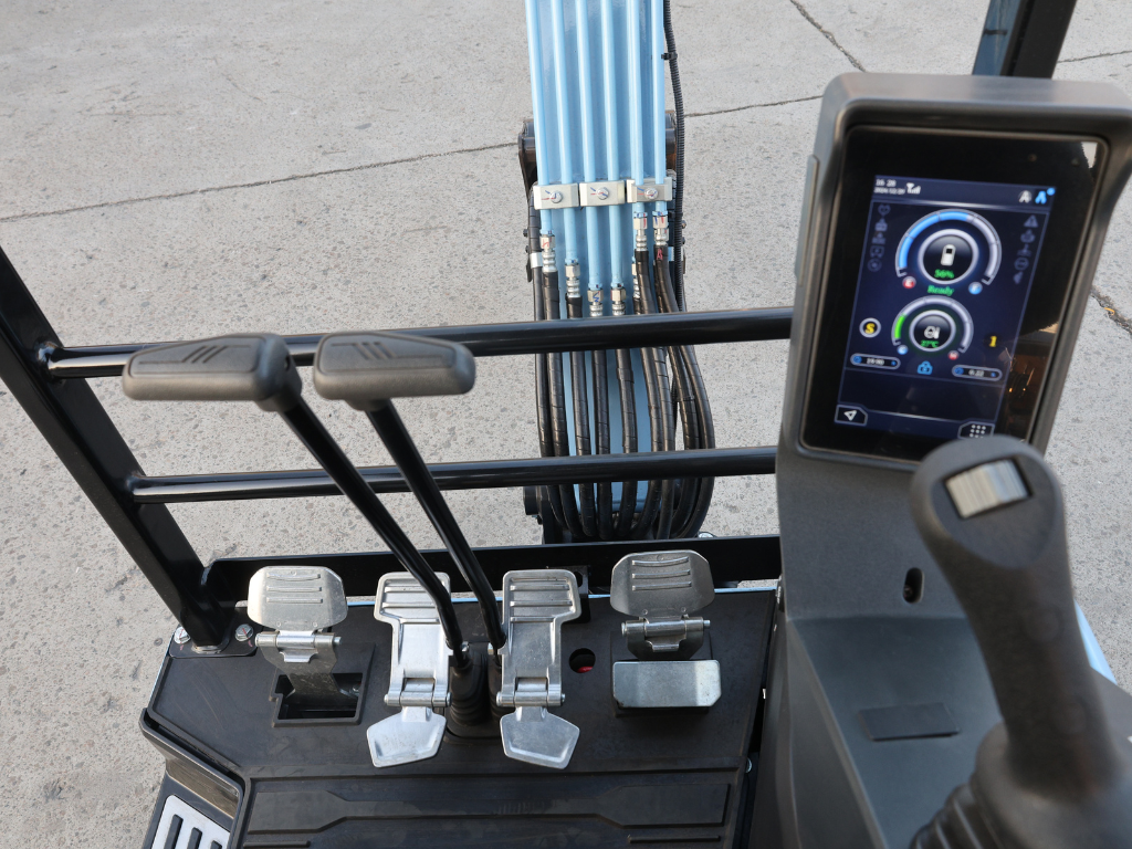 Föraren har en lugn arbetsmiljö med låg ljudnivå, ergonomiskt säte och justerbara armstöd. Reglagen är responsiva och gör det lätt att jobba exakt även på trånga ytor. En tydlig 7-tums färgdisplay ger bra överblick, och nyckellös start med lösenord skyddar maskinen mot obehörig användning.